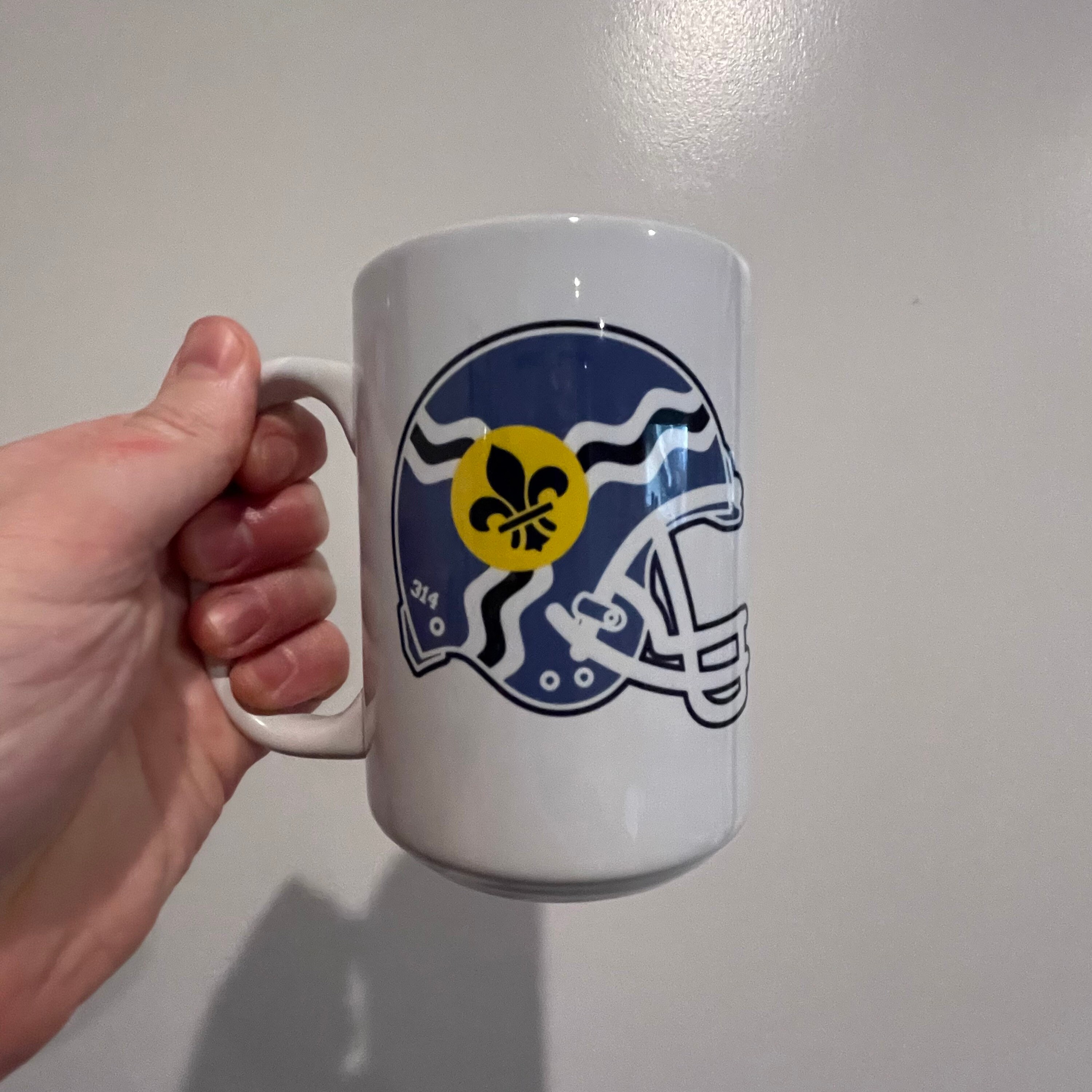 These are the large 15oz coffee mugs and proudly made in St Louis City. Each mug is 2 sided. The first side says “Ka Kaw-ffee: caffeinated in St Louis” with our STL Flag football helmet on the other.